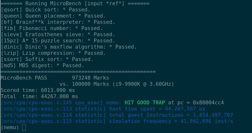 今天测试microbench的时候出现了更奇怪的问题,在执行完一个测试项之后堆的结束地址竟然发生了变化,之前我发现很多问题是我自己实现的printf有问题导致的,所以这次我直接用putstr来打印信息,最后定位到堆结束是在一轮测试结束后打印测试时间时出错的,也就是还有可能是printf导致的,于是我把printf注释掉,果然就可以了。。
